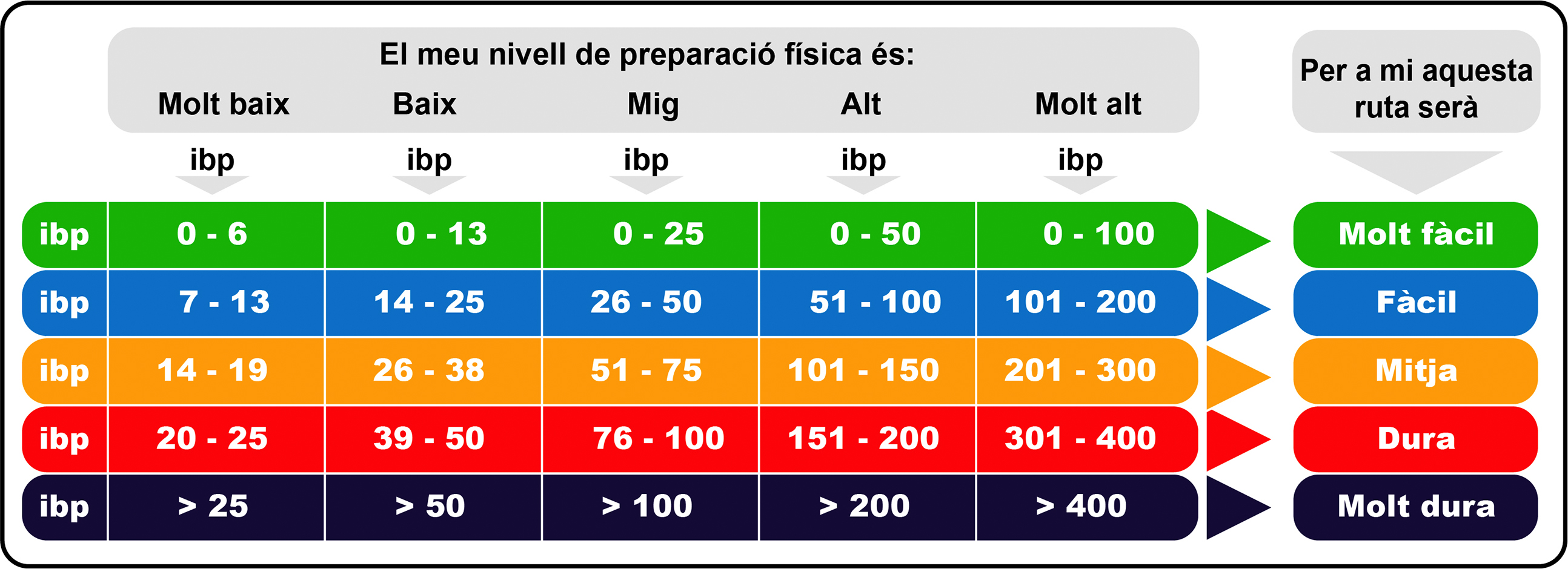 Cal tenir en compte que la duresa o l’esforç d’una ruta serà igual a: